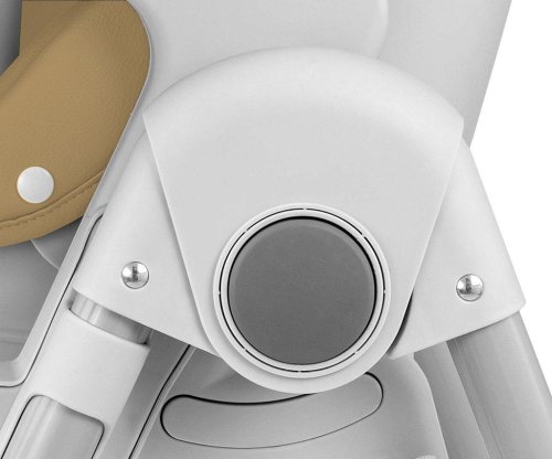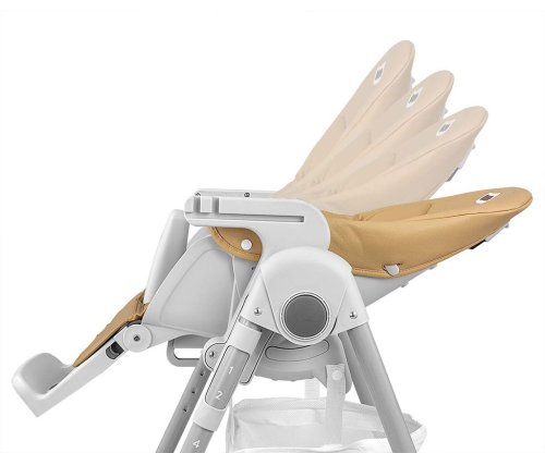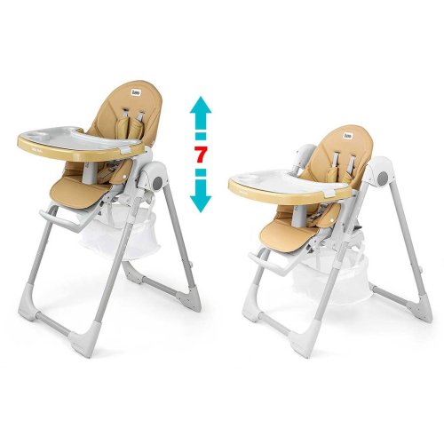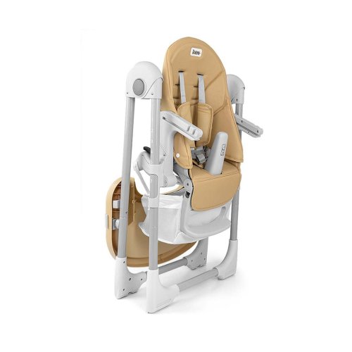 Čalúnenie stoličky je vyrobené z ekologickej kože a má navyše mäkkú vložku pre najmenších. Pre bezpečnosť dieťaťa je vybavená 5-timi bodovými nastaviteľnými pásmi a prídavnou zábranou proti pošmyknutiu. Na zadnej strane operadla je úchyt na zavesenie tácky. Operadlo aj podnožku je možné sklopiť do ľahu. Sedák je možné zdvihnúť alebo znížiť v 7 stupňoch a nohy majú zabudované gumové kolieska. Celú konštrukciu je možné ľahko a hladko zložiť.