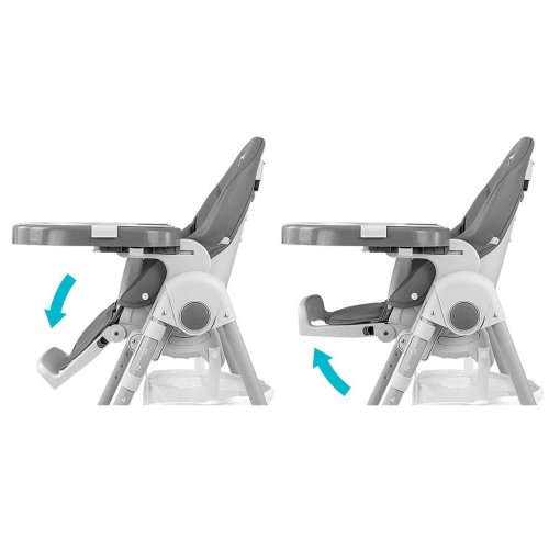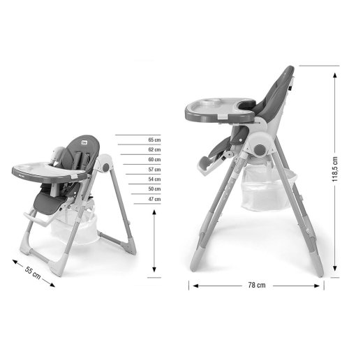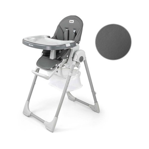 Čalúnenie stoličky je vyrobené z ekologickej kože a má navyše mäkkú vložku pre najmenších. Pre bezpečnosť dieťaťa je vybavená 5-timi bodovými nastaviteľnými pásmi a prídavnou zábranou proti pošmyknutiu. Na zadnej strane operadla je úchyt na zavesenie tácky. Operadlo aj podnožku je možné sklopiť do ľahu. Sedák je možné zdvihnúť alebo znížiť v 7 stupňoch a nohy majú zabudované gumové kolieska. Celú konštrukciu je možné ľahko a hladko zložiť.