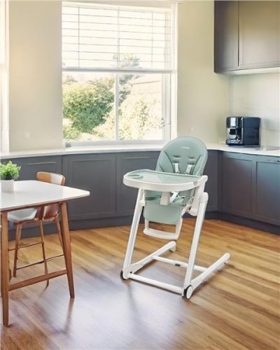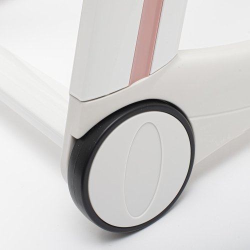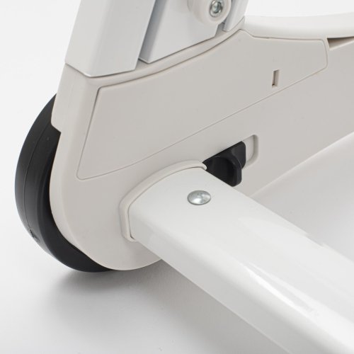 -Jedálenská stolička je vybavená dvoma brzdenými kolieskami a dvoma gumovými nožičkami.
