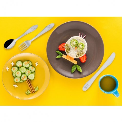 Príbory s rytým motívom medvedíka slúžia na nácvik správneho stolovania.