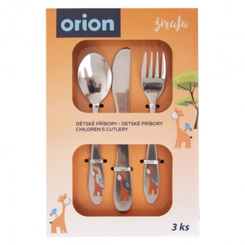 Sada detských príborov s farebným dekórom žirafy. Obsahuje lyžicu, vidlišku a nôž. Nerezový materiál 18/0. Neodporúčame umývať v umývačke riadu (možné porušenie farebného obrázku). Dĺžka 15.5 cm (lyžica a vidlička) a 17 cm (nôž). EAN 8592381156183
