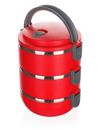 priemer: 14,5 cm objem: 3 x 0,55 l celkový objem: 1,65 l materiál: vo vnútri nerez 201 (sila nerezu 0,30 mm), plast - polypropylén farba: červená