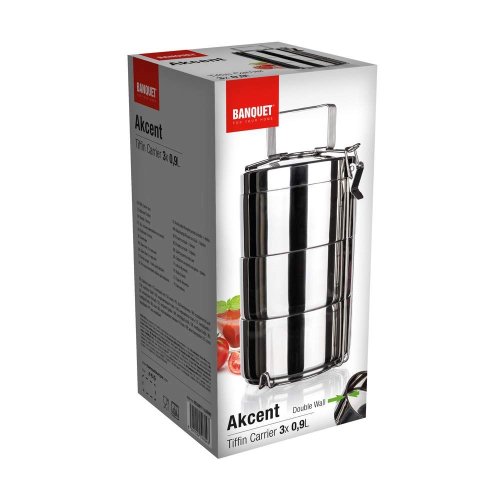 3dielny nerezový dvojstenný jedlonosič AKCENT je určený na prenášanie potravín a hotových pokrmov. Sada obsahuje 3 nerezové dvojstenné misky s priemerom 14 cm a výškou 7 cm. Vďaka dvojstennému prevedeniu je praktický na uchovanie teplého pokrmu počas prenášania.
