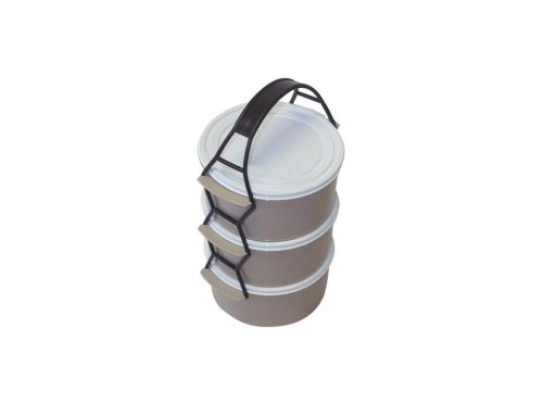 Box na ukladanie a prepravu jedla, zložený z 3 dielov, ktoré sú navzájom prepojené držadlom.