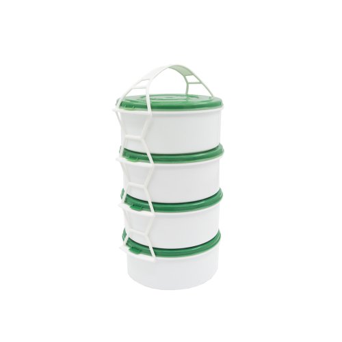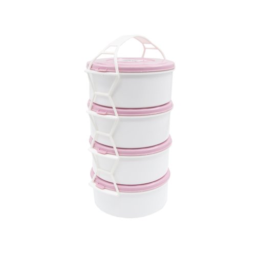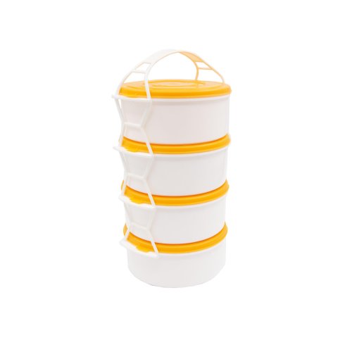 Box na ukladanie a prepravu jedla, zložený zo 4 dielov, ktoré sú navzájom prepojené držadlom.