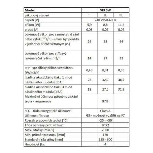 • POUŽITIE: Lokálna rekuperačná jednotka SRJ 3W zaručuje moderný spôsob vetrania, ktorý umožňuje privádzať čerstvý vzduch do interiéru bez úniku tepla. Vďaka tomu je vhodná aj pre nízkoenergetické a pasívne domy. Rekuperačná jednotka zabraňuje vzniku plesní a tvorbe alergénov tým, že privádza do interiéru čerstvý vzduch, ktorý je zbavený prachu, peľu a ďalších nečistôt. Obmedzuje únik tepla pri vetraní tým, že využíva tepla z odvádzaného vzduchu na ohriatie privádzaného vzduchu.