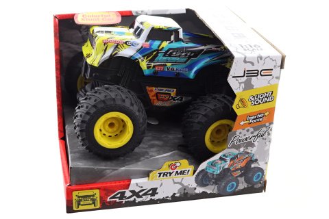 Jeep na batérie s veľkými kolesami na zotrvačník. Napájanie na 3xAG13 batérie (sú súčasťou balenia). Auto vydáva zvuky štartu a rýchlej jazdy. Materiál plast. Balené v otvorenej krabici. Rozmery balenia 19,5x15x18 cm. Vek 3+