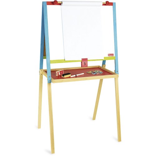 Dvojica tabúľ na rozkročenej drevenej konštrukcii vybavená veľkým odkladacím či úložným priestorom. Na čiernu tabuľu sa píše a kreslí kriedou, bielu tabuľu možno popisovať zvlášť určenými fixkami a mazať plstenou hubkou. Súčasťou výbavy je aj držiak na rolky papiera, ktoré sú dodávané zvlášť ako príslušenstvo. Vyrobené vo Francúzsku, z masívneho bukového a borovicového dreva francúzskeho pôvodu. Súčasti sú ošetrené výhradne za použitia farieb a lakov na báze vody. Balené v kartóne potlačenom rastlinnými atramentmi. Súčasťou balenia sú kriedy, fixka, hubka, sada vzorovaných magnetických písmen, kolíček a rolka papiera. Hlavné vlastnosti:tabuľa, 3 kriedy, fixka, hubka, sada magnetických písmen, kolíček a rolka papierarozmery tabule 56x43 cmpre kriedy/magnetická pre fixydržiak pre papierové roleveľký odkladací priestorvyrobené vo Francúzsku
