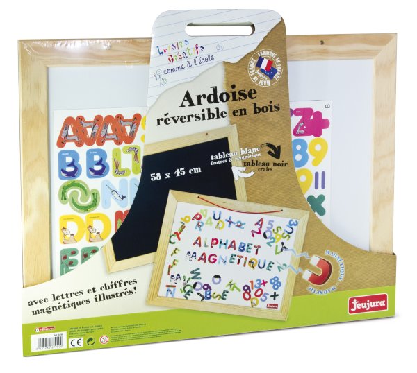 Závesná obojstranná magnetická tabuľa. Na čiernu tabuľu sa píše a kreslí kriedou, bielu tabuľu možno popisovať zvlášť určenými fixkami a mazať plstenou hubkou. Vyrobené vo Francúzsku, z masívneho bukového a borovicového dreva francúzskeho pôvodu. Súčasti sú ošetrené výhradne za použitia farieb a lakov na báze vody. Balené v kartóne potlačenom rastlinnými atramentmi. Súčasťou balenia je sada vzorovaných magnetických písmen. Hlavné vlastnosti:tabuľa a sada magnetických písmenrozmery tabule 58x45 cmoboustranná pre kriedy/fixy, magnetickávyrobené vo Francúzsku