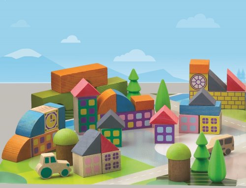 Stavebnice z klasických rôznorodých, pestro dekorovaných kociek, doplnené o jednoduché drevené vozidlá a hernú podložku. Sú vyrábané vo Francúzsku, z masívneho bukového a borovicového dreva francúzskeho pôvodu. Kocky sú ošetrené výhradne za použitia farieb a lakov na báze vody. Každá sada je balená v praktickom lepenkovom kufríku potlačenom rastlinnými atramentmi. Hlavné vlastnosti: 40 kociek z masívneho dreva a podložkapraktické balenievyrobené vo Francúzsku