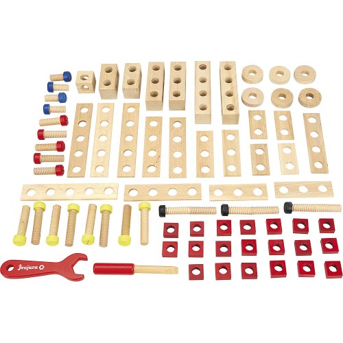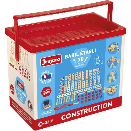 Bohatá sada rôznych dielov stavebnice vrátane náradia. Obsahuje skrutky, matice, kocky aj kolieska. S radom stavebnice pre malých domácich majstrov môže Vaše dieťa dať voľný priechod svojej fantázii. Jednotlivé sady sú spolu kompatibilné, je možné ich dopĺňať, kombinovať a zbierať. S každou ďalšou sadou výrazne vzrastie počet možností, ktoré sa vašimi dieťaťu otvoria. S pomocou tejto hračky je možné precvičiť jemnú motoriku, logiku a sústredenie. Váš malý vynálezca na ňu bude v dospelosti s láskou spomínať. Vyrobené vo Francúzsku, z masívneho bukového a borovicového dreva francúzskeho pôvodu. Súčasti sú ošetrené výhradne za použitia farieb a lakov na báze vody. Sada je balená v praktickom lepenkovom vedierku potlačenom rastlinnými atramentmi a súčasťou balenia je brožúra so vzorovými stavbami a ich detailmi. Hlavné vlastnosti: 68 dielikov, kľúč a skrutkovač z masívneho drevakompatibilný s ďalšími sadami radu pre malých domácich majstrovpraktické balenievyrobené vo Francúzsku