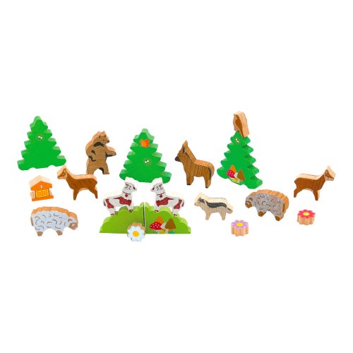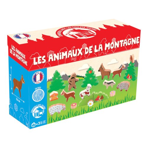 Súprava zvieratiek z hôr, vrátane doplnkov. Figúrky k stavebniciam Jeujura Constructions môžu slúžiť aj samostatne. Sú ponúkané v tematicky zameraných sériách, ale dajú sa rôzne kombinovať. Rovnako ako stavebnice sú vyrábané z masívneho dreva a sú ošetrené výhradne za použitia farieb a lakov na báze vody. Hlavné vlastnosti: obsahuje 10 zvieratiek s doplnkamivyrobených vo Francúzsku
