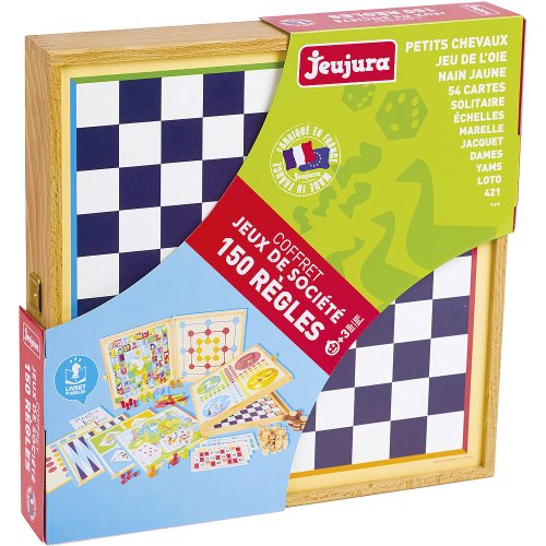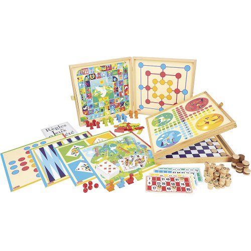 Rozsiahly súbor stolových, doskových a kartových hier v ucelenom praktickom balení. Nájdete tu dámu, mlyn, variant človeče nehnevaj sa s figúrkami koní, hus a súbor obsahuje aj balíček bridžových kariet a žetóny aj kartičky pre bingo. Príslušenstvo k hrám je spoločne s pravidlami balené v boxe, ktorého plochy slúžia ako herné dosky. Súprava je vyrábaná vo Francúzsku, z masívneho bukového a borovicového dreva francúzskeho pôvodu. Drevené súčasti sú ošetrené výhradne za použitia farieb a lakov na báze vody, papierové príslušenstvo je potlačené rastlinnými atramentmi. Hlavné vlastnosti: 16 figúrok koní, 4 figúrky husí, 40 hracích kameňov, 5 kociek, dva druhy žetónov a 54 karets súčasti z masívneho drevapraktické balenievyrobené vo Francúzsku