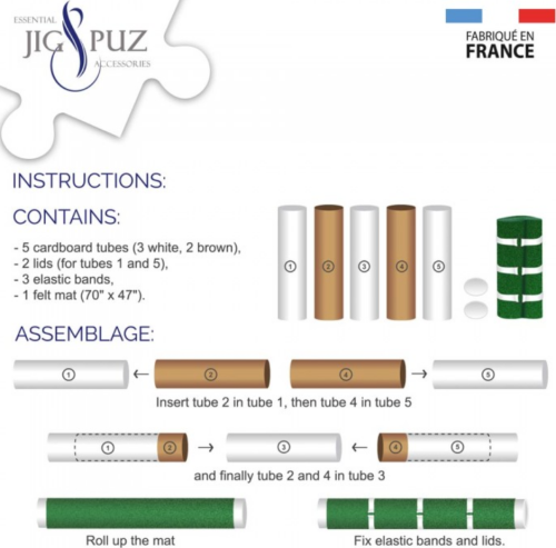 Rolovacia podložka vhodná pre puzzle do veľkosti 170 x 110 cm (zodpovedá 6.000 dielikov väčšiny výrobcov). Koberček na puzzle je ideálny na úsporu miesta a bezpečné uchovanie nedokončeného aj hotového obrázku. Podložka zaistí bezpečné uchovanie alebo transport vášho puzzle. Koberček pod puzzle je ideálnym pomocníkom na úsporu miesta a bezpečné prevážanie alebo uchovanie rozoskladaného puzzle. Veľký rozmer poskytuje dostatok miesta na roztriedenie dielikov. Balenie obsahuje 5 dielov kartónových tubusov, zelenú filcovú podložku o rozmere 180 x 120 cm, 2 plastové viečka a 3 upínacie pásky. UPOZORNENIE: V prípade zakúpenia koberčeka na skladanie puzzle iných značiek odporúčame overiť rozmery zloženého puzzle. Údržba filcovej podložky: Podložku je možné žehliť na najnižšiu teplotu najlepšie cez tenkú tkaninu (utierku). Ručné pranie v studenej vode, nežmýkať a nesušiť v sušičke.