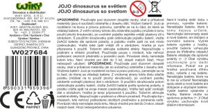 Jojo dinosaurus. Rozmery 5,5x3,5 cm. Svetelné efekty. 2xAG3 batérie súčasťou. 4 varianty - žltá, zelená, červená, modrá.