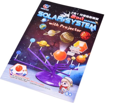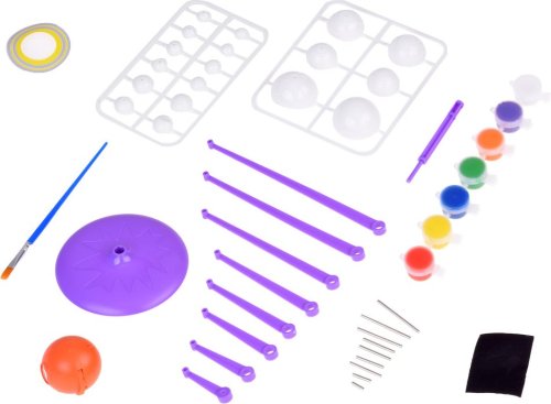 Sada obsahuje: projektor (Slnko), planéty, farby, štetec, rám, oceľové tyče, šmirgľový papier, prstenec Saturnu, brožúrku v anglickom jazyku, návod. Napájanie Slnka: na 3 x AG3 (súčasťou balenia).