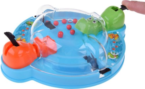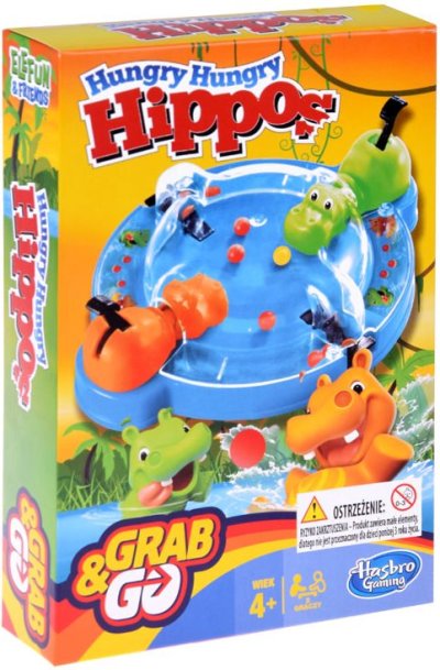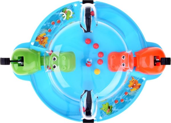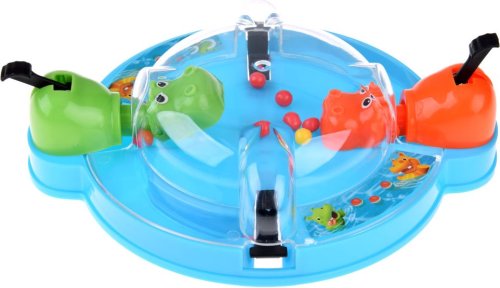 pomocou pohyblivých chvostov malých hrošíkov môžeš otvoriť papuľu a vtiahnuť guličky do brušiek týchto roztomilých zvieratiek potom, čo chytíš všetky guličky, spočítaj, koľko guličiek sa nachádza v nádobkách každého hráča vyhráva ten, kto ich nazbiera najviac hra učí reflexom, rozlišovanie farieb