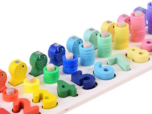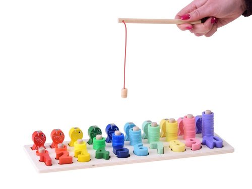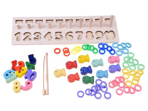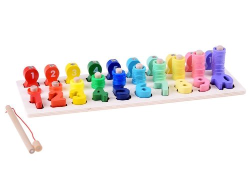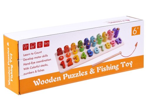 Najlepšou formou vzdelávania je učenie sa hrou. Vďaka tejto hádanke sa dieťa naučí čísla od 1 do 10 zábavným spôsobom. Sada obsahuje: - drevený podstavec s číslami a kolíkmi - čísla od 1 do 10 - drevené očíslované ryby - 55 plastových krúžkov v 10 farbách - rybársky prút s magnetom Hádanka Vám umožní cvičiť úlohy s rôznym stupňom obtiažnosti s Vaším dieťaťom. 1. prispôsobenie tvarov - pri hraní sa dieťa naučí rozlišovať tvary jednotlivých čísel 2. rybolov - pomocou rybárskeho prútu s magnetom usporiadajte očíslované ryby na správne miesta. 3. použitie správneho množstva krúžkov - Dieťa sa učí hodnote danej číslice, učí sa počítať do 10. S hračkou môžete tiež zaobchádzať ako s počítadlom.