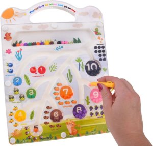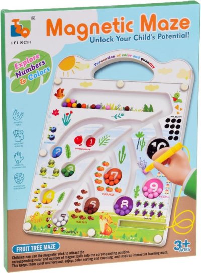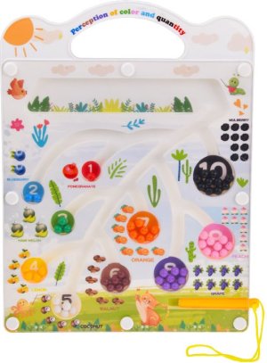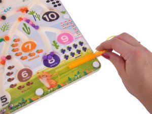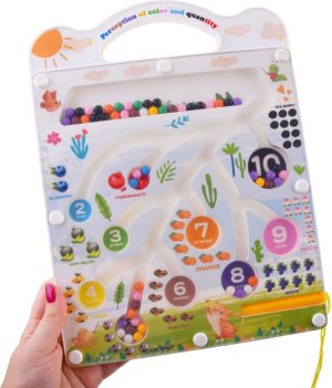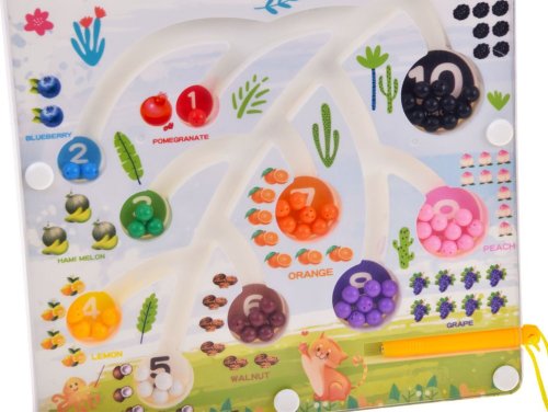 Doska je vyrobená z odolného plastu v príjemných farbách a zdobí ju pútavé, detsky prívetivé motívy, ktoré podporujú chuť do hry. Veľkým plusom je, že všetky pohyblivé časti sú bezpečne uzavreté za priehľadným sklom – guličky sa nestratia a nehrozí ich prehltnutie. Ako sa hrá? Úlohou dieťaťa je pomocou špeciálneho magnetického pera navádzať guličky do správnych otvorov. Prečo si vybrať túto hračku?