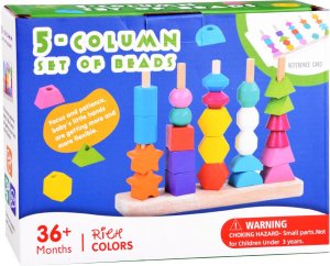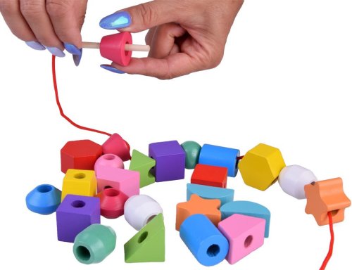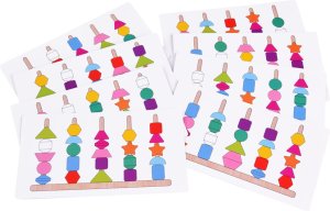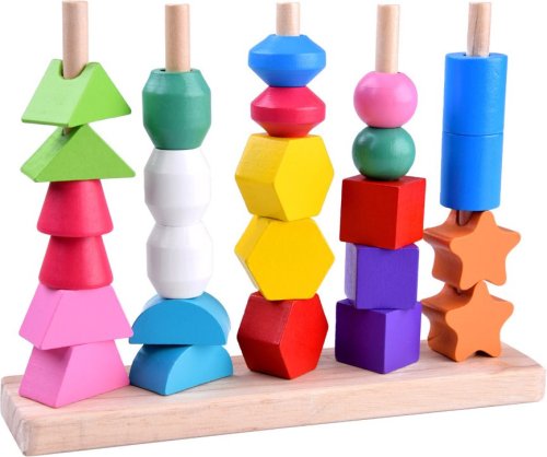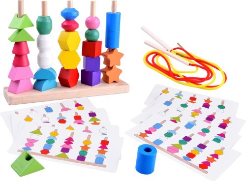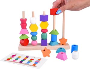 pozitívne ovplyvňuje schopnosť rozlišovať tvary, farby a koordináciu ruka-oko, dieťa sa môže hrať dvoma spôsobmi - nasadzovaním kociek na kolíky podľa priložených kariet alebo navliekaním na povrázok, kocky s intenzívnymi, výraznými farbami iste upútajú pozornosť mnohých detí a povzbudí ich k hre, 5 obsahuje kolíky, 2 navíjacie povrázky a karty s úlohami.