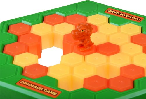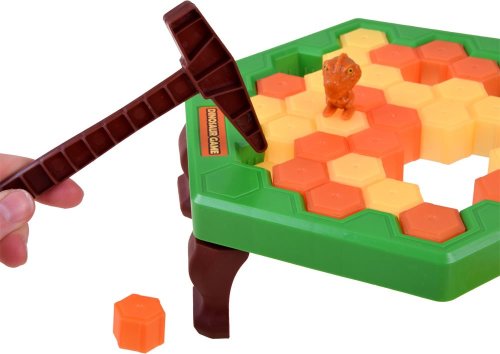 Ako hrať? Hráči sa striedajú v otáčaní kolesa a ukazovateľ určuje, koľko a aké farby kociek majú zhodiť. V ďalšej fáze je potrebné urobiť dôležité rozhodnutie. Ktorú kocku zraziť, aby ste nezrazili dinosaura? S každým ďalším kolom je rozhodovanie ťažšie. Kladivo do ruky! Je čas zraziť vybranú kocku ... Prehráv á ten, kto zhodí kocky aj s dinosaurom.