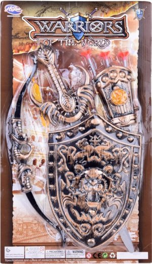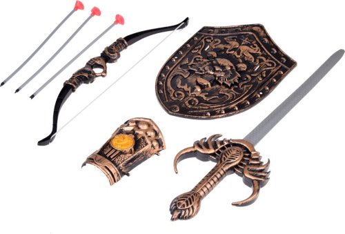 Luk – Dĺžka cca 44 cm, ideálna na precvičovanie „lukostreľby“. Toulec – Rozmery: 13 x 9 cm, na uloženie šípov a dokreslenie rytierskeho vzhľadu. Šípy - Dĺžka cca 24 cm, bezpečné pre deti a navrhnuté pre hru. Štít - Rozmery: 29 x 20 cm, chráni statočného bojovníka v boji. Meč - Dĺžka 50 cm, ideálna pre súboje s imaginárnymi nepriateľmi.