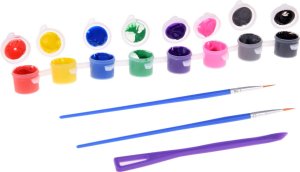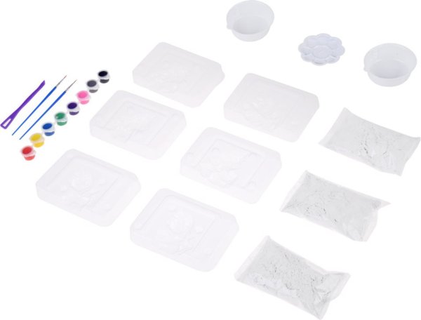 Sada obsahuje: 3 vrecúška so sadrou, 3 formy na odlievanie jednorožcov, 2 odmerky, 1 paleta na miešanie farieb, 8 farieb, 2 štetce, 1 plastový nožík