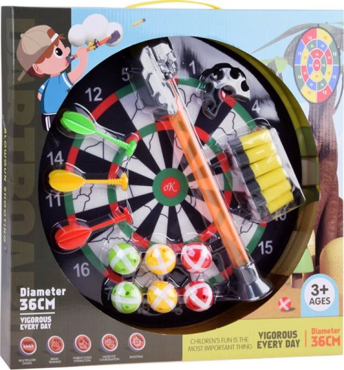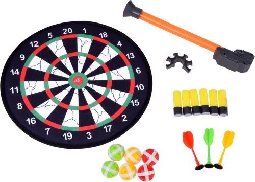 okrúhly terč 6 loptičiek 3 šípky bez hrotu 6 penových nábojov fúkačka na náboje držiak na penové náboje