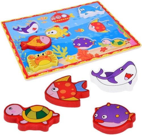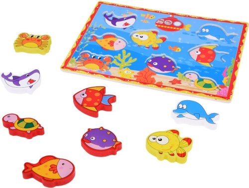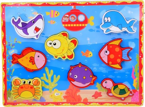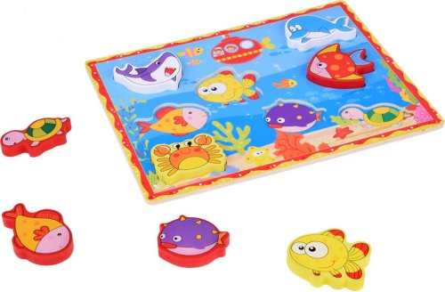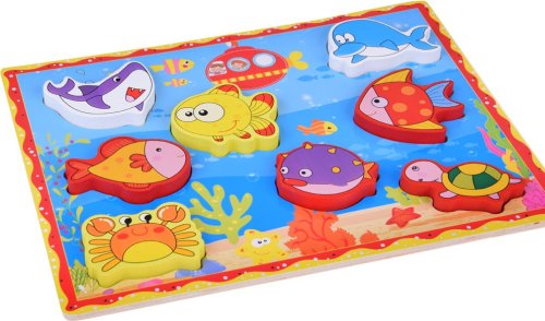 Drevená skladačka spája prvky učenia a zábavy. Pri hraní si dieťa precvičuje schopnosť porovnávania, pozorovania a jemnú motoriku. Zároveň sa dieťa môže naučiť názvy morských živočíchov. Hračka bola vyrobená s dôrazom na detail, je úplne bezpečná pre dieťa. Veľké, masívne dieliky skladačky sa ľahko zdvíhajú a umiestňujú do príslušných otvorov. Farebné ilustrácie a zaujímavé farby podporujú detskú predstavivosť a lákajú k hre. Úlohou dieťaťa je priradiť dieliky skladačky k ilustráciám a tvarom na drevenej doske. Doska obsahuje 8 prvkov. Rozmery dosky: Cca 30 cm x 22,5 cm x 1,5 cm Skladačka je skvelým tréningom logického myslenia a trpezlivosti. Spoločné tvorenie a vymýšľanie príbehov o morských tvoroch bude zaujímavým nápadom, ako stráviť čas spoločne.