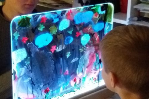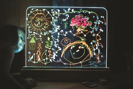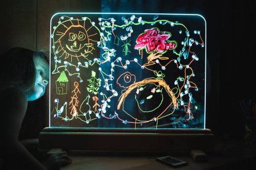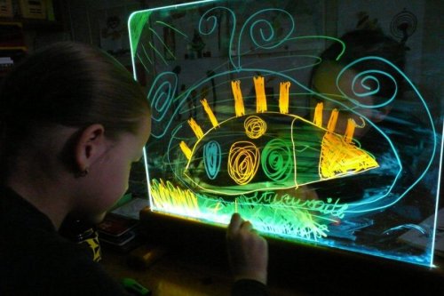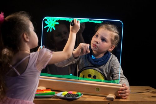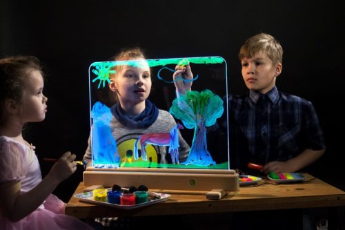 Exkluzívna magická svetelná tabuľka ponúka rôznorodé využitie. Na tabuľku z tvrdeného skla je možné maľovať predovšetkým vodovými farbami, a to štetcami alebo prstami, ale aj zmývateľnými fixami. Maľovať je možné obojstranne, deti tak môžu vytvárať obrázok spoločne. Tabuľku po použití ľahko vyčistíte a pripravíte na ďalšie diela. Príjemné osvetlenie je zaistené úspornými LED diódami vo vnútri spodného rámu tabuľky. Jas, farbu aj režim svetla je možné ľubovoľne nastavovať, k dispozícii je množstvo rôznych nastavení. Tabuľka je napájaná a dodávaná s 12 V/2 A adaptérom so sieťovou vidlicou pre bežné 230 V zásuvky. Ovládač na napájanie využíva jednu CR2025 batériu (nie je súčasťou balenia). Nie je vhodné pre epileptikov. Tabuľku možno ďalej využiť ako: kulisu k divadlnástenku ponukovú tabuľku kaviarní / reštauráciu nočnú lampu Hlavné vlastnosti: svetelná tabuľka s diaľkovým ovládačom úsporná LED technológia nastavenie jasu16 rôznych farieb4 dynamické režimy