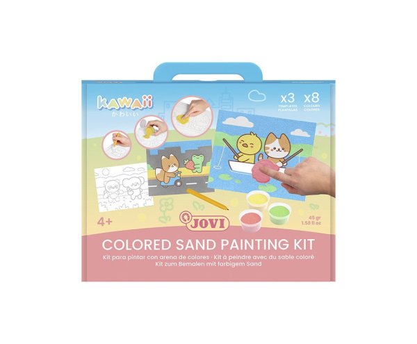 Kreatívna súprava - Namaľujte si vlastný svet Kawaii pomocou farebného piesku. Originálna sada na maľovanie scén v štýle Kawaii pomocou mäkkého farebného piesku. Ideálna aktivita pre deti, ktorá spája umenie, zábavu a rozvoj kreativity. V praktickom kufríku nájdete 8 nádobiek s farebným pieskom, 1 špáradlo na nanášanie a 3 rôzne vzory, pripravené na dokončenie. Maľovanie pieskom pomáha deťom vyjadrovať emócie, zlepšuje komunikáciu a podporuje kreatívne myslenie. Výhody: jemnozrnný farebný piesok príjemný na dotyk, prírodný a udržateľný kremičitý piesok z miestnych lomov, farbenie prírodnými pigmentmi, nefarbí, nešpiní, netoxický, bez zápachu a hlavných alergénov. Bezpečná a hravá forma umeleckého vyjadrenia, ideálna pre deti všetkých vekových kategórií.