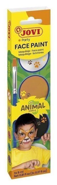 Sada farieb na tvár Animal World od JoviVysoko kvalitné farby na tvár s jemnou krémovou textúrou a perfektnou krycou schopnosťou. Farby sú odolné voči vysokým teplotám a sú úplne neškodné. Farba sa ľahko aplikuje priamo na tvár. Nie je potrebné použiť podkladovú bázu. Po aplikácii rýchlo schne a nezanecháva pocit mastnoty. Je ľahko odstrániteľná mydlovou vodou, odličovacím mliekom. Dermatologicky testované. Vhodné pre deti od 3 rokov. Balenie farieb na tvár Animal World obsahuje: 3 x 8ml farby (čierna, biela, oranžová), 1x hubky, 1x plochý štetec.