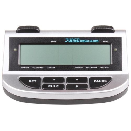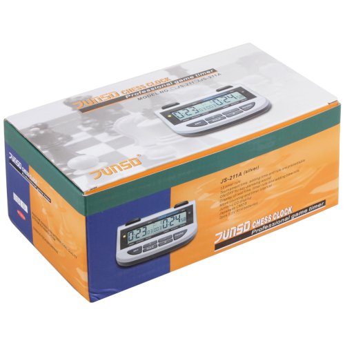 Šachové hodiny JUNSD JS-211A patria medzi profesionálne modely, sú vhodné pre šachové turnaje aj rekreačných hráčov, ktorí chcú svoju hru posunúť na vyššiu úroveň. Tieto hodiny tiež ponúkajú nádherný dizajn a veľký LCD displej, vďaka ktorému čísla uvidíte jasne a zreteľne. Vlastnosti: 13 rôznych pravidiel časovača; rôzne výbery programov; 2 rôzne zvuky časovača pre dvoch hráčov; hrací čas, ťahy – môžu byť zaznamenané automaticky; zobrazuje celkový počet ťahov, časový interval a čas pre oboch hráčov; veľký LCD displej; 2x 1.5V R14 batéria; 108 x 90 x 65 mm. Batérie sú súčasťou balenia.
