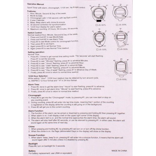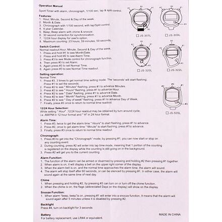 Športové stopky JUNSD JS-322L sú vďaka svojej nízkej cene a jednoduchému ovládaniu vhodné pre každého trénera, školy, športové oddiely alebo športovcov, ktorí chcú mať prehľad o časoch svojich výkonov. Oproti klasickému modelu JS-322 ponúka navyše praktickú funkciu podsvietenia displeja. Súčasťou balenia je aj šnúrka na krk. Vlastnosti: - hodiny, minúty, sekundy & dni v týždni - dátum - stopky s presnosťou 1/100 sekundy - alarm - 30 sekundová korekcia pre synchronizáciu - 12/24 hodinový displej - maximálny počet: 23h 59min 59sek - podsvietenie displeja