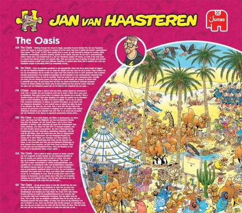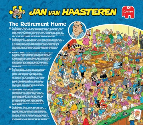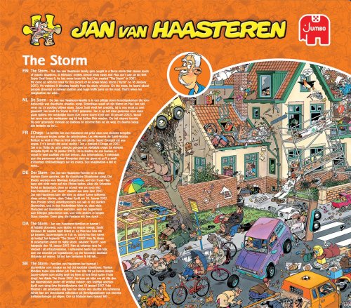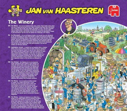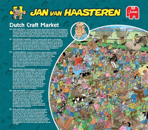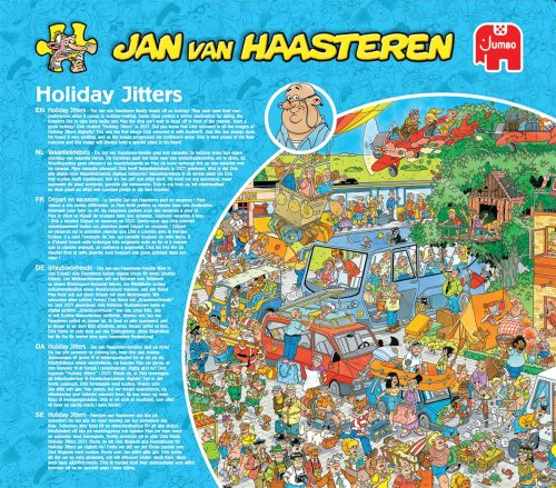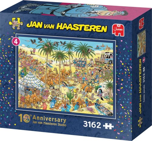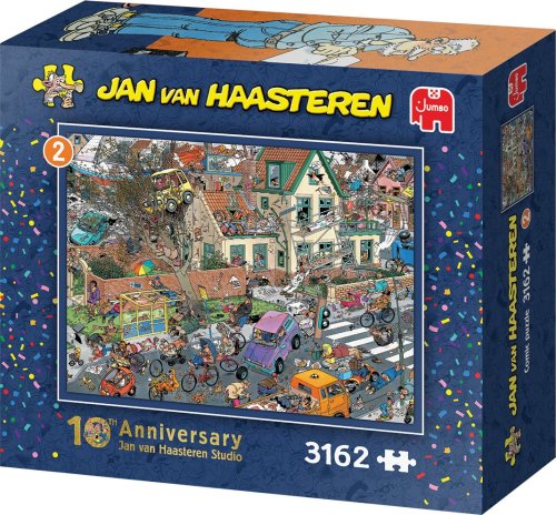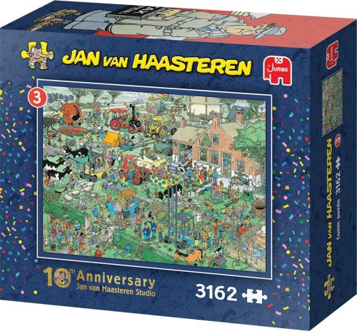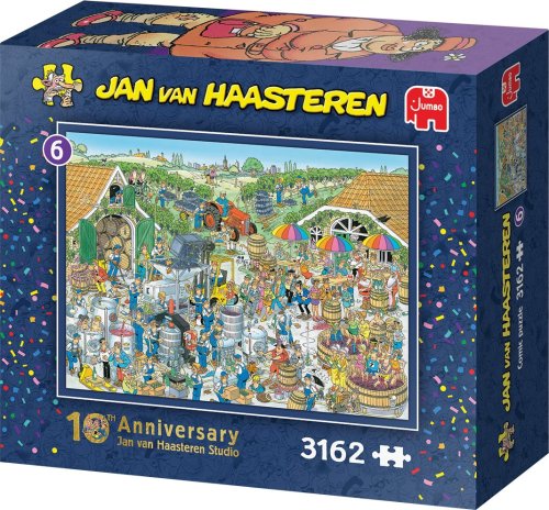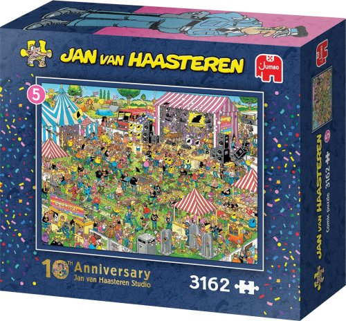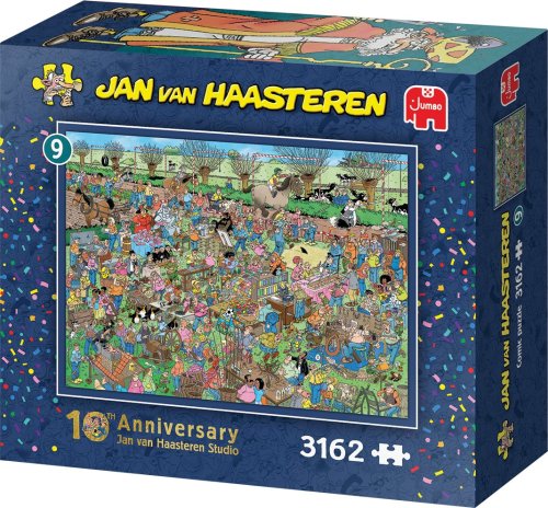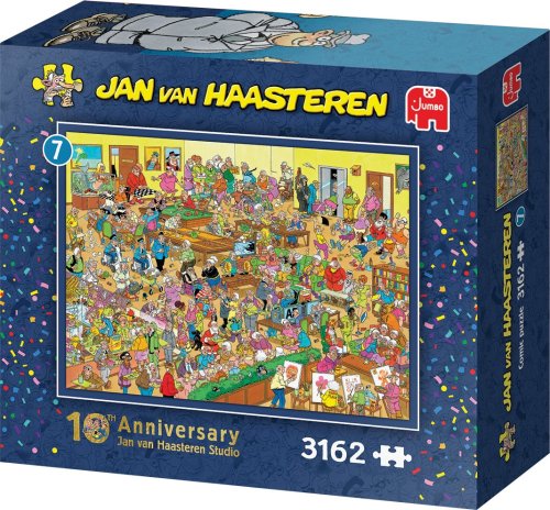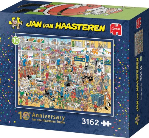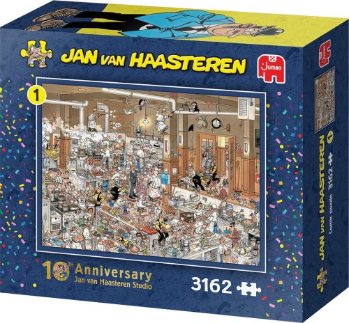 Je čas na párty! Štúdio Jan van Haasteren existuje už 10 rokov a pri tejto príležitosti vychádza veľmi špeciálne puzzle v luxusnej krabici s celkom 30 200 dielikmi a dĺžkou 6 metrov! Puzzle Jan van Haasteren je oveľa viac než len puzzle, je to dobrodružná séria so známymi postavami, ktoré hrajú hlavné role vo svete plnom absurdných detailov. Objavte bláznivé dobrodružstvá rodiny Jan van Haasteren. Desať samostatne balených puzzle po 3162 dielikoch po zložení vytvorí veľkoformátový obraz s tisíckami zábavných detailov. Súčasťou tejto limitovanej edície je 10 plagátov A3 s jednotlivými motívmi. Puzzle Jumbo sú vyrobené z recyklovaného kartónu. K výseku dielikov sú použité najtenšie dostupné nože a puzzle má po zostavení iba minimálne medzery medzi dielikmi. Bavte sa s Haasterenom Skladanie puzzle od Jana van Haasterena je veľmi pestré a zábavné, preskúmate každý vtipný detail a zabavíte sa na dlhé chvíle. V súlade so svojimi tradíciami komponuje Jan van Haasteren do svojich predlôh svoju známu značku, ktorú ako prví jeho fanúšikovia hľadajú - žraločia plutva a ruky, ktoré vyzerajú, ako by nikomu nepatrili! A tiež mnoho ďalších detailov, ktoré nájdete na takmer všetkých jeho ilustráciách - zubnú protézu, Mikuláša a Haasterenov vlastný portrét. Veľmi detailné, farebné a predovšetkým vtipné ilustrácie od autora menom Jan Van Haasteren výhradne pre JUMBO. Jeho kresby majú výrazne rozoznateľný štýl - vtipné obrázky, veselé situácie a oveľa viac ľudí, než by ste očakávali! Puzzle z produkcie Jan van Haasteren sú po celom svete populárne a doteraz ich vytvoril viac ako 80. Ilustračné video