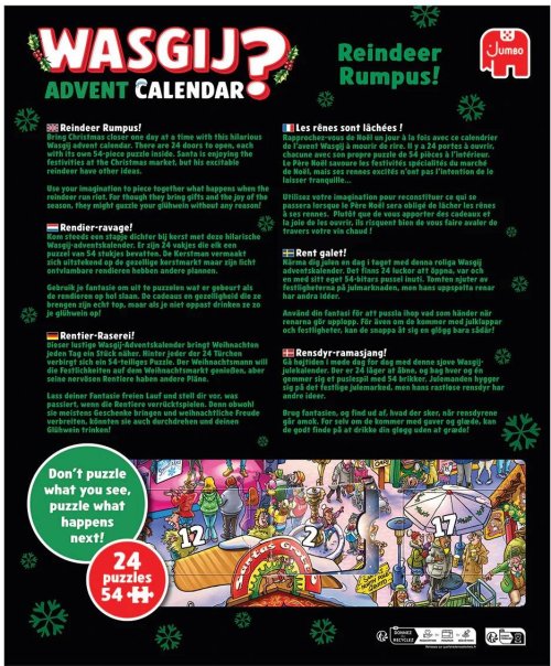 kalendár obsahuje 24 rôznych puzzle obrázkov s originálnym motívom, každé puzzle má 54 dielikov, rozmer jedného puzzle je cca 16,5 x 11,5 cm.