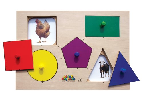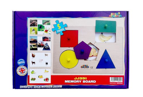 Just Jigsaws 391 Tvary a pamäť - drevené doskové puzzle 6 dielov a 4 predlohy je náučná netradične poňatá edukatívna doska, zameraná na výučbu tvarov, farieb a trénovania pamäte. Doska má 5 vyfrézovaných geometrických otvorov a 5 príslušných farebných puzzle dielikov s štipcami pre ľahký úchop, plus bočný otvor pre zasunutie predlôh. Dodáva sa spoločne s 3 zalaminovanými listami formátu A4, na ktorých je vždy 5 rozpoznateľných obrázkov a jedným prázdnym listom iba s naznačenými tvarmi na kopírovanie a dorobenie podľa vlastnej fantázie. Vyberte si jednu zo štyroch tematických predlôh, obsahujúcu reálne fotografie a zasuňte do drevenej dosky. Potom zakryte obrázky 5 príslušnými drevenými puzzle dielikmi a snažte si spomenúť, pod ktorým tvarom sa ukrýva aký obrázok. Táto pamäťová doska predstavuje skvelý spôsob zábavy a zlepšovania pamäťových schopností a zároveň učí deti farby a tvary. Sada obsahuje: 1 hracia doska, 5 dielov rôznych tvarov a 4 predlohy a 1 prázdnu pre vlastnú fantáziu.