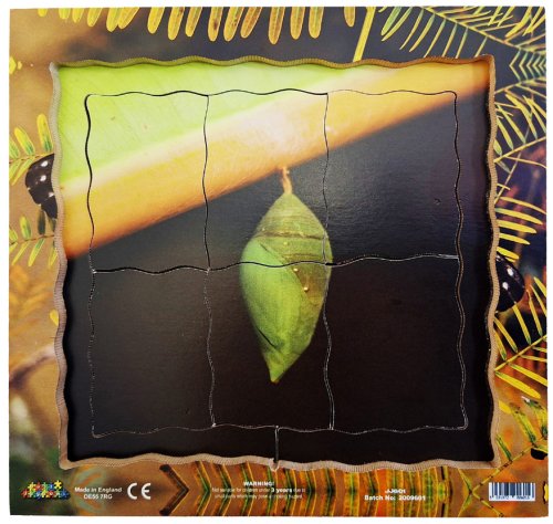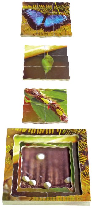 Just Jigsaws 601 Motýľ a jeho životný cyklus - drevené vrstvené puzzle 19 dielov. Objavujte s týmto netradičným puzzle životný cyklus motýľa. Edukatívne puzzle, vďaka ktorému môžu deti skúmať zázračné premeny prírody prostredníctvom skutočných fotografií. Vrstvené puzzle obsahuje obrázky 4 fáz vývojového cyklu. K videniu sú reálne fotky: vajíčok, húsenice, počiatku kuklenia a dospelého motýľa. Sada obsahuje celkom 18 kusov puzzle dielikov a 1 základňu s rámčekom.