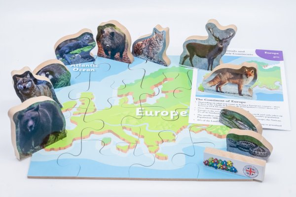 Just Jigsaws 775 Európa a jej zvieratá - drevené puzzle 16 dielov a 10 zvierat je vzdelávacia sada, ktorej zmyslom je zoznámiť deti s jednotlivými kontinentmi a ich faunou. Cieľom je správne poskladať mapu daného svetadielu a pomenovať všetky zvieratá, ktoré na ňom žijú. Sada obsahuje 10 reálne vyobrazených, voľne stojacich zvierat na MDF doske s hrúbkou 1,5 cm, 1 mapu kontinentu na MDF doske s hrúbkou 0,4 cm rozrezanú na 16 kusov a informačný list s jednoduchými vysvetľujúcimi informáciami o danom kontinente a niektorých jeho zvieratách. Toto edukatívne puzzle je skvelou voľbou pre všetkých, ktorí majú radi prírodu a zároveň deti chcú hravým spôsobom pripraviť na budúce hodiny zemepisu.