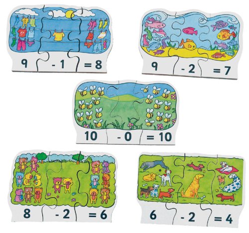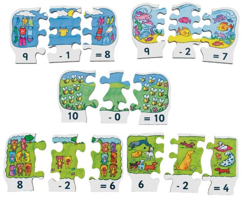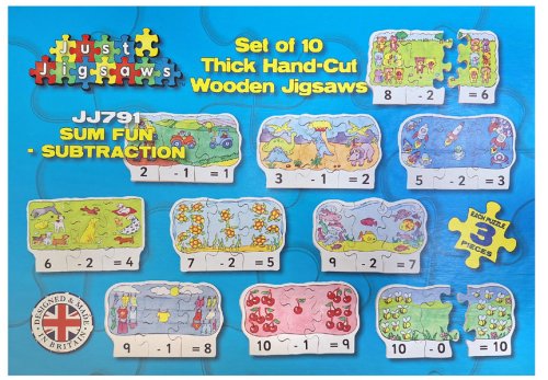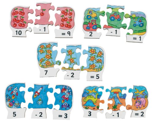 Just Jigsaws 791 Odčítanie - drevené puzzle 30 dielov. Táto drevená matematická skladačka pomôže deťom precvičiť jednoduché počty zábavnou formou. Ponúka 10 matematických úloh na odčítanie. Na každom dieliku sú nakreslené obrázky zodpovedajúce numerickému číslu v jeho spodnej časti. Úlohou je zostaviť vždy k sebe 3 diely tak, aby vznikol správny výsledok. Skvelý úvod do jednoduchej matematiky. Súprava obsahuje 10 x 3 diely.