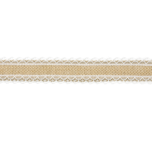 Jutová stuha s dvojitou čipkou. Rozmery 4 x 500 cm.