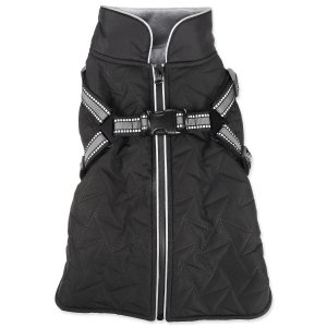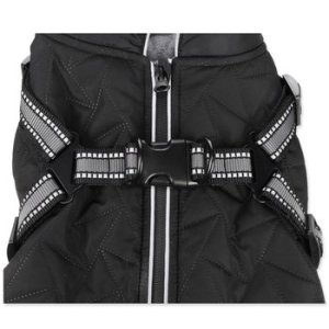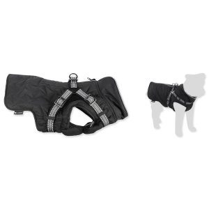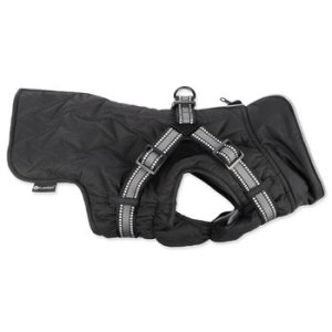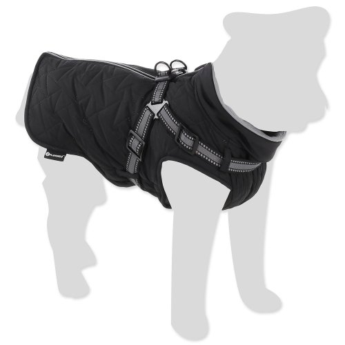 integrovaný postroj s reflexnými prúžkami, prešívaný vodeodolný materiál, príjemná fleecová podšívka, pohodlné zapínanie na chrbte psa.