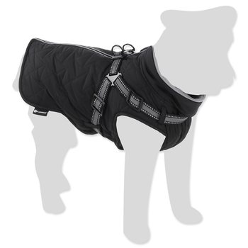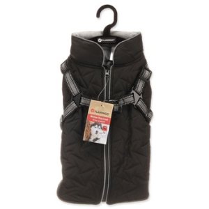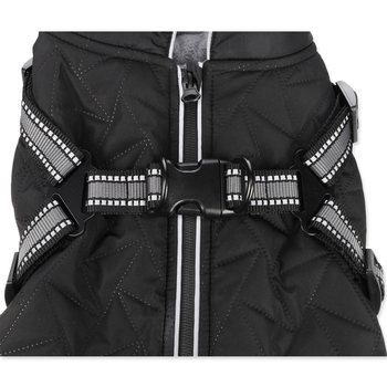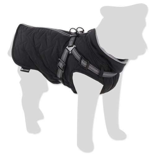 integrovaný postroj s reflexnými prúžkami, prešívaný vodeodolný materiál, príjemná fleecová podšívka, pohodlné zapínanie na chrbte psa.
