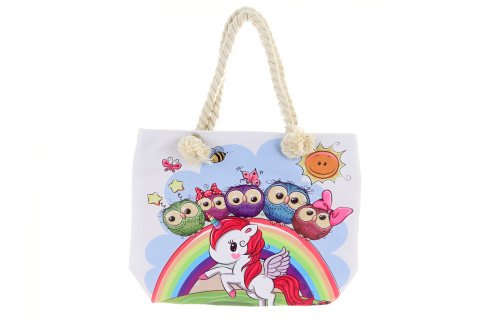 Kabelka cez rameno s motívom jednorožca a sovičiek. Zadná strana látková, predná strana lesklá (koženka). Rozmery kabelky 28x22 cm. Balené v sáčku. Výrobok nie je hračka.