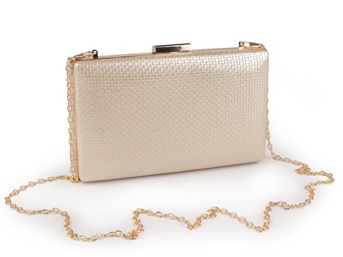 Malá spoločenská kabelka vyžaruje eleganciu a luxus, má metalický lesk. Povrch má zaujímavú kockovú štruktúru. Zdobí ju výrazné lesklé zapínanie a rámček po celom obvode. Kabelka je pevne vystužená, jej súčasťou je dlhá odnímateľná retiazka na karabíny. Môžete ju nosiť v ruke alebo ako crossbody cez rameno alebo do kríža.