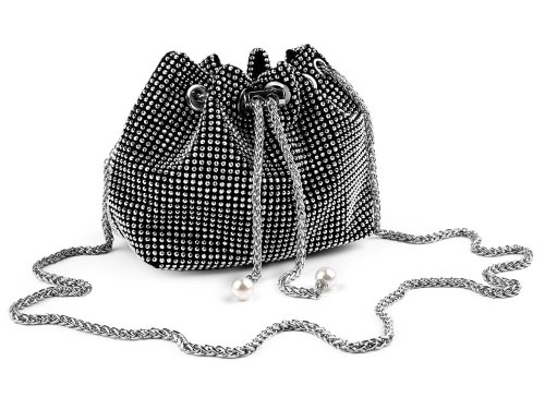 Elegantná sťahovacia kabelka ozdobená brúsenými kamienkami sa efektne trblieta. Uzatvára sa pomocou kovovej retiazky s brzdičkou, konce retiazky sú ozdobené veľkými perlami. Napriek svojej malej veľkosti je kabelka vďaka rozšírenému dnu veľmi priestranná, zmestí sa do nej mobil, peňaženka, kľúče, vreckovky aj drobná kozmetika. Vnútri má vrecko na zips. Súčasťou kabelky je guľatá odnímateľná retiazka, môžete ju nosiť cez rameno alebo krížom ako crossbody alebo len tak v ruke. Kabelka je veľmi univerzálna, hodí sa na spoločenské udalosti, využijete ju aj na diskotéky a párty, obľúbite si ju aj na bežné nosenie. Je zabalená v ochrannom obale z netkanej textílie.