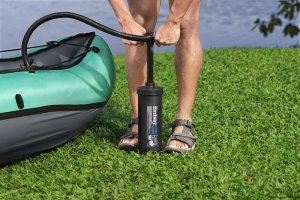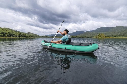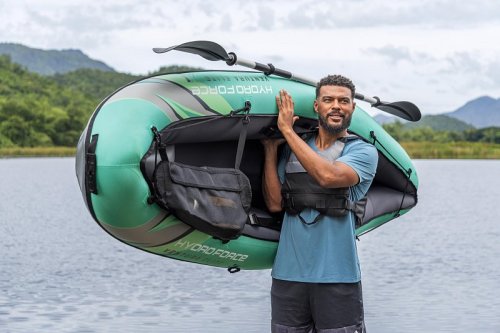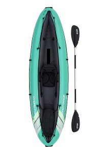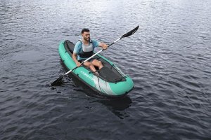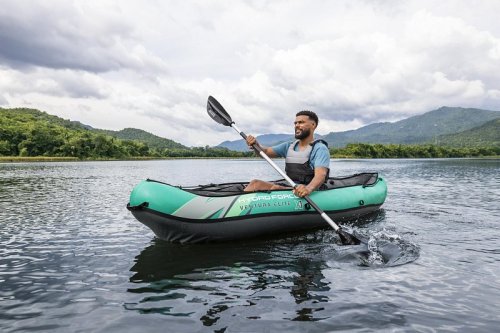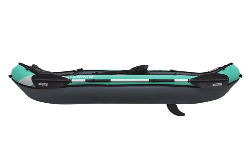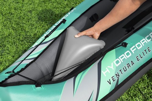 Bestway® Kajak set Hydro-Force™ Ventura Elite™ je ideálnou voľbou, ako posunúť vaše outdoorové zážitky na novú úroveň. Tento jednomiestny kajak je vyrobený z kvalitného nylonu s ochrannou vrstvou, ktorý je odolný voči vode, oleju aj UV žiareniu a zvládne aj náročnejšie podmienky. Pre maximálny komfort je kajak vybavený nastaviteľným operadlom a praktickým úložným priestorom vrátane odnímateľnej tašky na drobnosti. Odolná PVC podlaha. Tri vzduchové komory zvyšujú bezpečnosť a stabilitu. Certifikácia GS od TÜV SÜD potvrdzuje splnenie vysokých bezpečnostných štandardov pre bezstarostnú zábavu na vode. Nechýbajú ani odnímateľné plutvy pre lepšiu smerovú stabilitu, madlá pre ľahké prenášanie a ventily pre rýchle nafúknutie aj vyfúknutie. Súčasťou balenia je hliníkové pádlo 230 cm, ručná pumpa Air Hammer ™, transportná taška a opravná sada - všetko, čo potrebujete pre okamžité vyplávanie. Pre 1 osobu. Maximálna nosnosť 130 kg. Rozmery v nafúknutom stave: 40 x 86 x 280 cm. Rozmery vo vyfúknutom stave: 113 x 285 cm. Rozmery balenia: 58 x 44 x 33 cm.