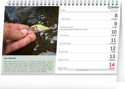 Zaujímajú vás najnovšie trendy zo sveta rybárskeho športu? Potom určite oceníte náš stolný rybársky kalendár. Dozviete sa o rybách i výbave, ktorú by mal každý rybár mať a poznať, aj tom, ako vyzerá život človeka, ktorý rybárčinou doslova žije. Kalendár dopĺňa české týždenné kalendárium s menami, sviatkami a pamätnými dňami, fázami mesiaca a rozšírený zoznam mien.