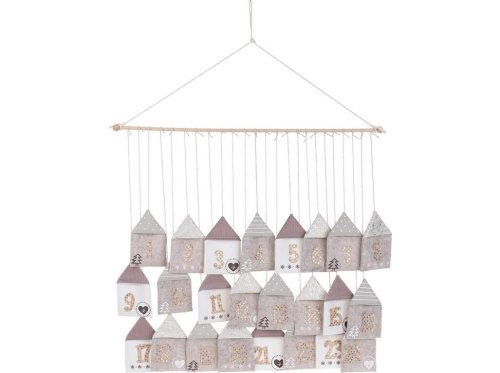 romery: 70 x 60 cm materiál: plsť, povrázky, drevená hrazda farba: krémová, ružová, šedá so zlatými glitrovými dekoráciami motív domčeky s číslami 1 - 24