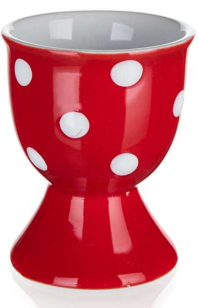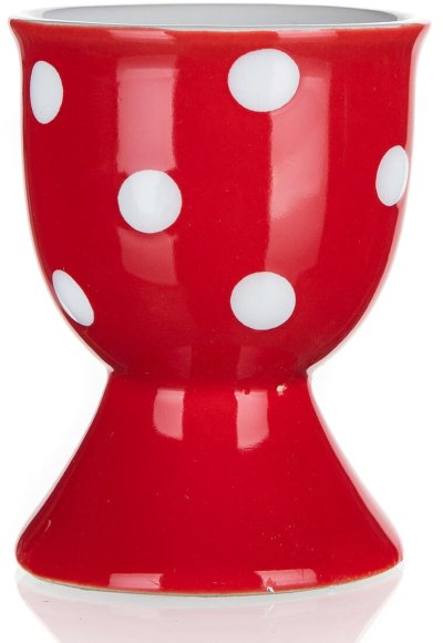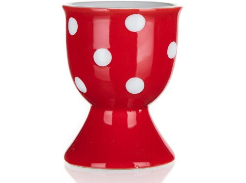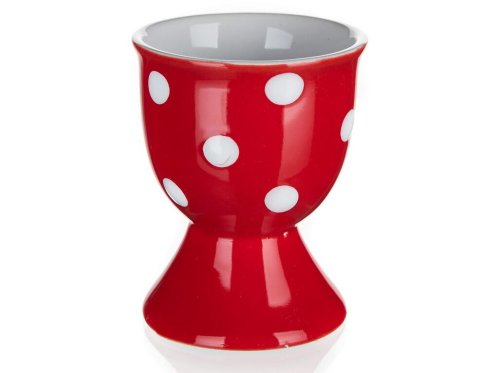 Kalíšok na vajíčko DOTS, v červenej farbe s bielymi bodkami, je vyrobený z keramiky.